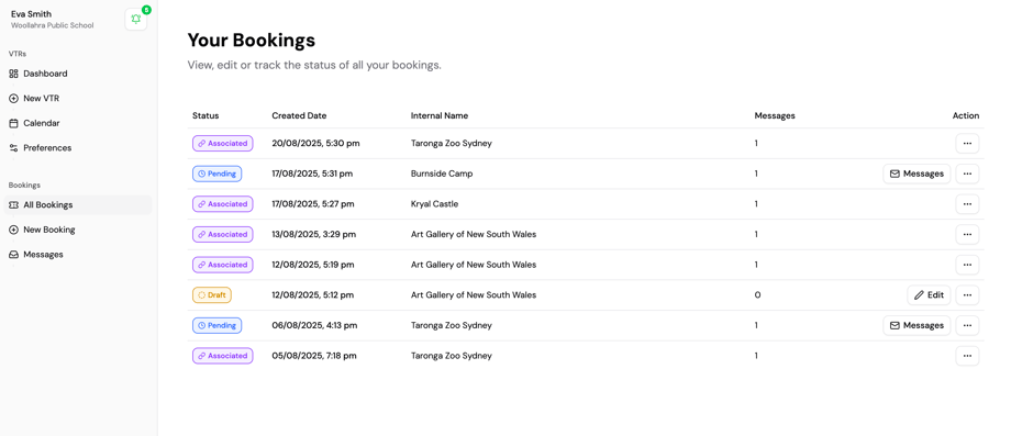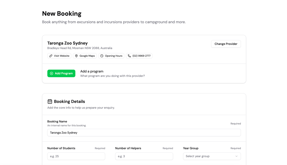 The bookings dashboard shows every request, confirmed booking and message with providers. You can check progress at a glance and never lose track of what’s happening. The steps adapt to your school’s process, so staff and admin can work the way they always have — just with less admin.