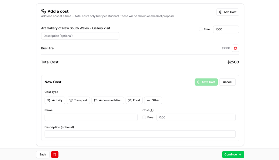 Record transport, activities, meals, accommodation or any other expense. Categories can be customised to match how your school records budgets.