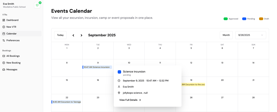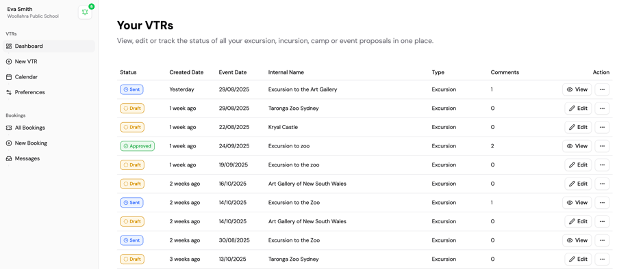 The VTR Dashboard gives you one clear view of every excursion, camp and event across your school. It works with your existing systems and can be shaped to match the way your school already manages activities. From upcoming dates to proposals in progress, it keeps planning organised and simple.