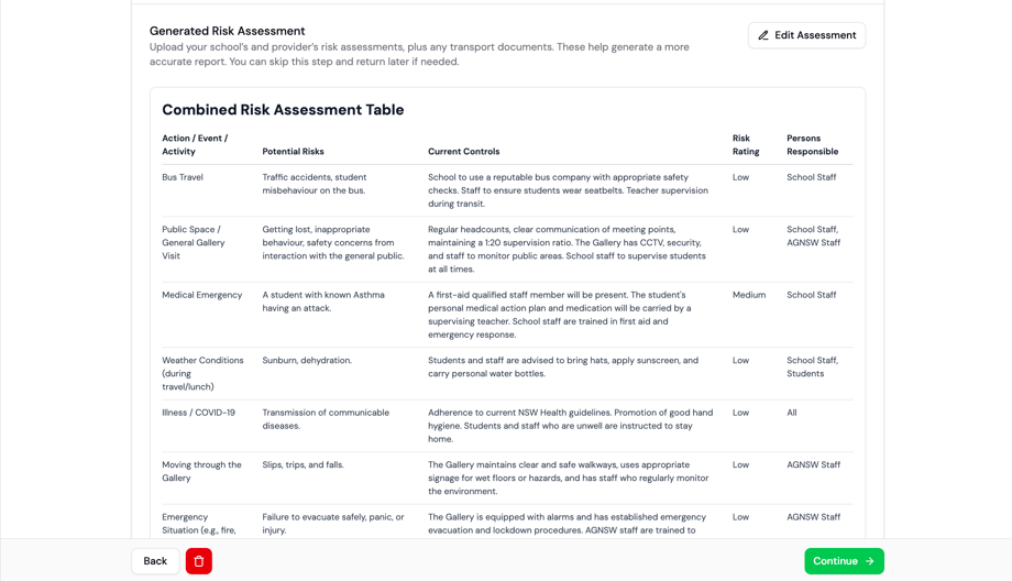 Once complete, the AI compiles your inputs into a structured risk assessment that matches your school’s requirements. It’s not a replacement for your professional input—it’s a way to present it more clearly and consistently.