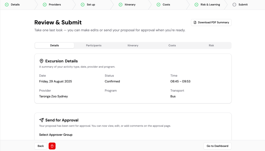 Teachers land on a clear summary page where they can double-check details before sending their proposal for review. This makes sure the right information is captured and saves time when approvals move up the chain.